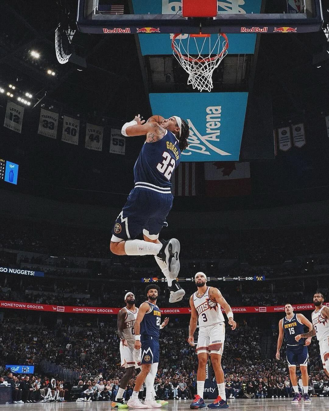 掘金的防守核心逻辑是约基奇蹲守禁区+外围单兵围剿。戈登是这个体系中唯一能从1号位防到5号位的球员。