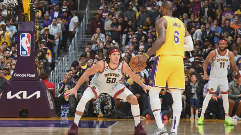 掘金的防守核心逻辑是约基奇蹲守禁区+外围单兵围剿。戈登是这个体系中唯一能从1号位防到5号位的球员。